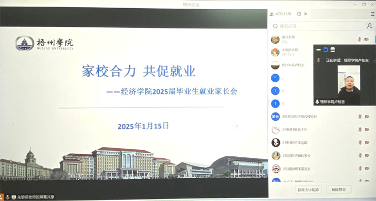 2025年1月15日晚上,学院通过线上方式召开2025届毕业生就业指导工作动员家长会,学院党委副书记卢桂吉、毕业班辅导谢兵、朱黎妍及2025届毕业生的家长参加会议。